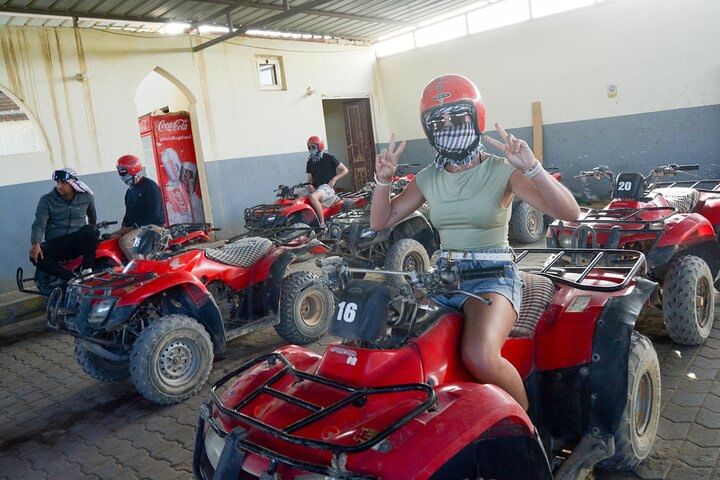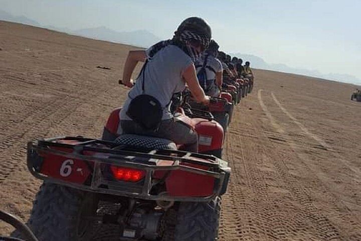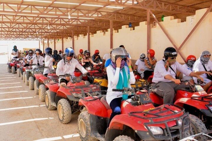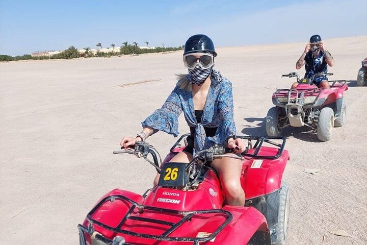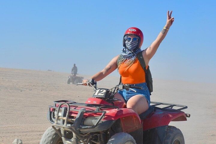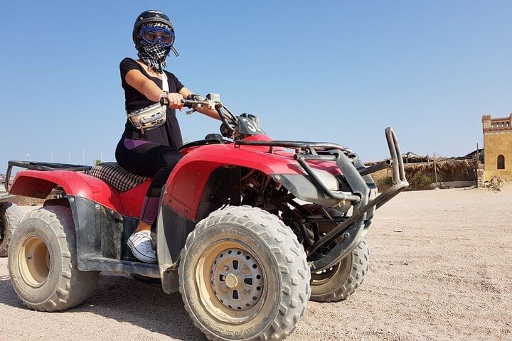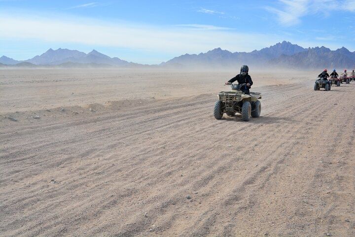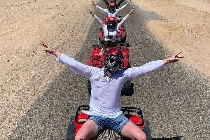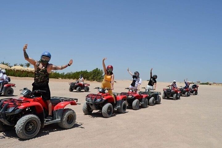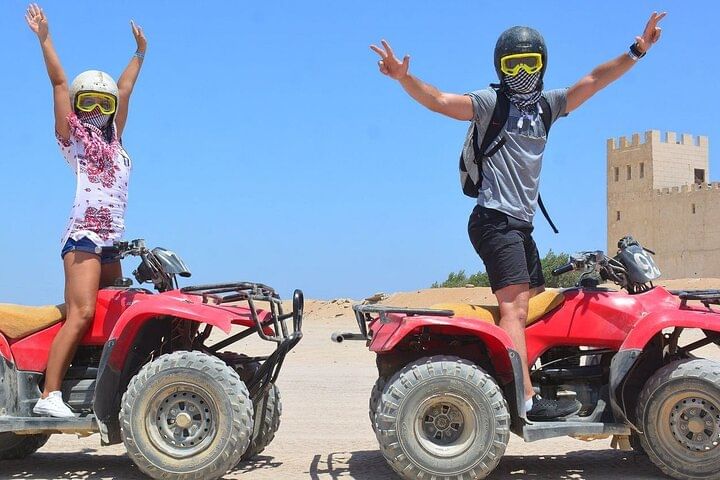 Experience the thrill of an ATV Quad tour in Hurghada, where you'll power across desert dunes to a Bedouin village 12 miles away. Enjoy traditional tea, ride a camel, and soak in the adventure before returning via ATV.